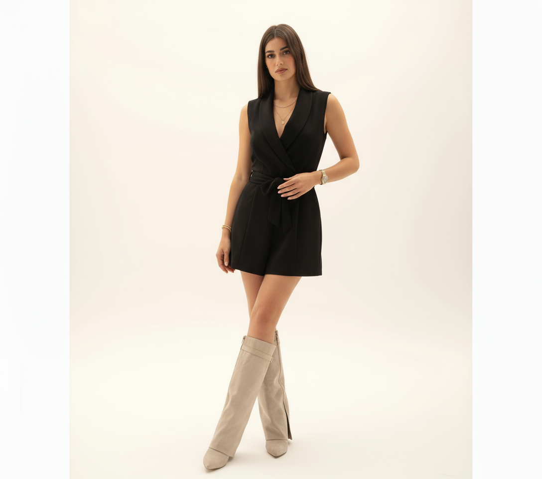 Denna sofistikerade jumpsuit kombinerar elegans med en smickrande omlottdesign. De vida byxbenen skapar en slank siluett, medan den figursydda passformen ger optimal komfort utan att kompromissa med stilen. Perfekt för formella, affärsmässiga eller stilfulla tillfällen.
